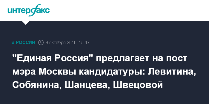 "Единая Россия" предлагает на пост мэра Москвы кандидатуры: Левитина, Собянина, Шанцева, Швецовой