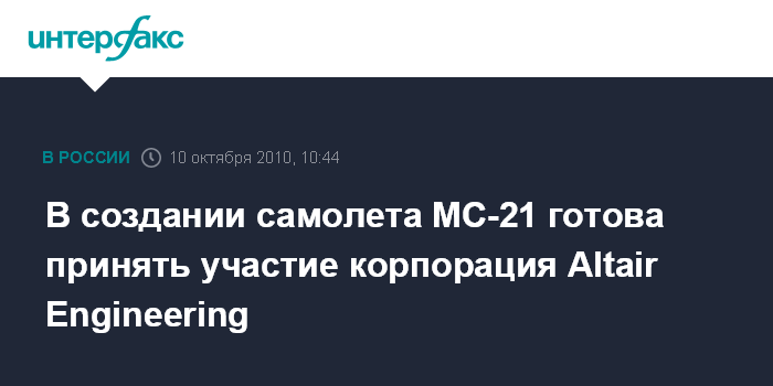 Москва. 10 октября. INTERFAX.RU - Транснациональная корпорация Altair Engineering, которая является мировым лидером в области инженерного консалтинга и технологий, направила российской стороне предложения по возможному участию в проекте создания перспективного самолета МС-21. "Мы готовы участвовать в проекте МС-21 и сообщили об этом тем, кто этим занимается. Пока этот вопрос обсуждается", - сообщил журналистам управляющий директор Altair Engineering в России и СНГ Леонид Рвачев.