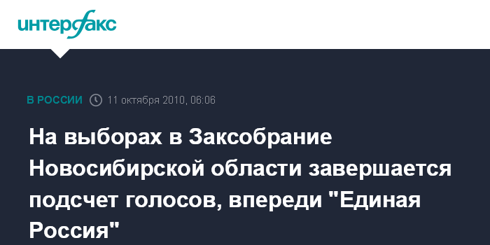 Новосибирск. 11 октября. ИНТЕРФАКС-СИБИРЬ - "Единая Россия" по итогам обработки 95,21% бюллетеней набирает 44,8% голосов избирателей на выборах в Законодательное собрание Новосибирской области.