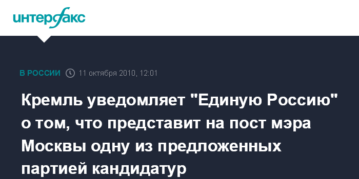 Кремль уведомляет "Единую Россию" о том, что представит на пост мэра Москвы одну из предложенных партией кандидатур