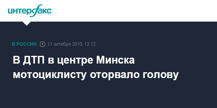 Минск. 11 октября. INTERFAX.RU - Во время ДТП, которое произошло в центре Минска, мотоциклисту оторвало голову, сообщили агентству "Интерфакс-Запад" в понедельник в ГАИ Минска.