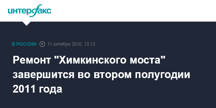 Москва. 11 октября. INTERFAX.RU - Мост через канал им. Москвы на выезде из столицы по Ленинградскому шоссе (известный среди горожан как "Химкинский мост") может быть открыт после ремонта во втором полугодии 2011 года, сообщил и.о. первого заместителя мэра Москвы, руководитель комплекса городского хозяйства Петр Бирюков.