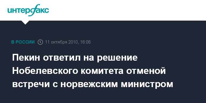 Лондон. 11 октября. INTERFAX.RU - Власти КНР отменили встречу с министром рыболовной промышленности Норвегии в связи с решением Нобелевского комитета присудить в этом году премию мира китайскому правозащитнику Лю Сяобо, сообщила в понедельник телерадиокорпорация BBC со ссылкой на МИД Норвегии.