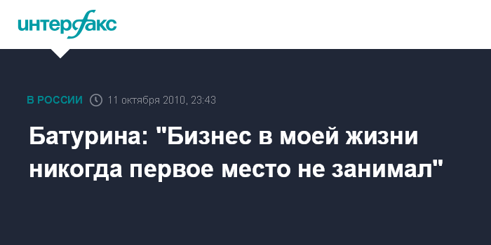 Е.Батурина также сказала, что это может показаться странным, но бизнес в ее жизни "никогда первое место не занимал". "Должна сказать - даже не второе", - добавила она.