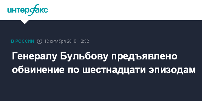 Москва. 12 октября. INTERFAX.RU1 - Главным следственным управлением Следственного комитета РФ предъявлено обвинение в совершении шестнадцати эпизодов преступлений бывшему руководителю департамента оперативного обеспечения ФСКН России Александру Бульбову, сообщил "Интерфаксу" официальный представитель СКП Владимир Маркин.