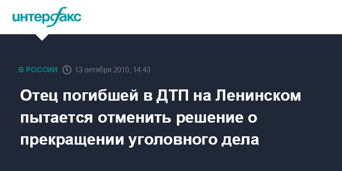Москва. 13 октября. INTERFAX.RU - Решение о признании законным прекращение уголовного дела о ДТП на Ленинском проспекте было обжаловано защитой родственников погибших в аварии в кассационной инстанции - Мосгорсуде.