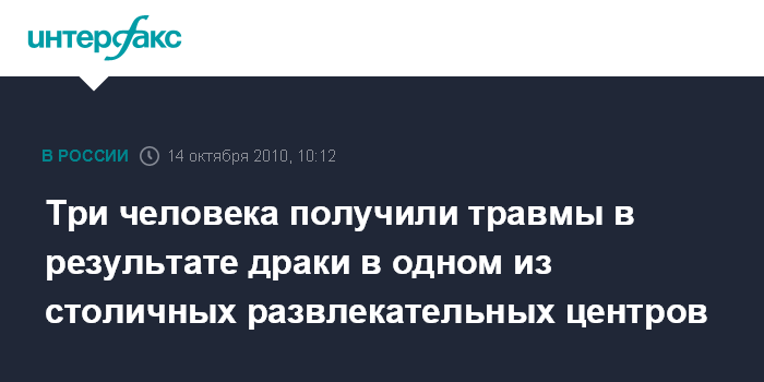 Москва. 14 октября. INTERFAX.RU - Трое пострадавших доставлены в больницу после массовой драки с применением травматического оружия в одном из развлекательных центров на севере Москвы в среду, сообщил Интерфаксу" источник в правоохранительных органах города.