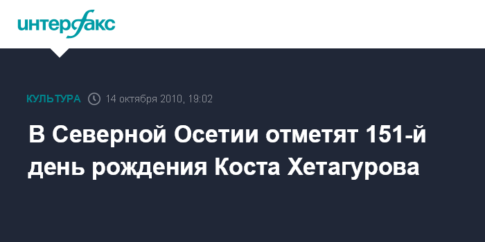 Владикавказ. 14 октября. INTERFAX.RU - Праздничные мероприятия, посвященные 151-летию со дня рождения основоположника осетинского языка и литературы Коста Хетагурова, пройдут 15 октября в Северной Осетии.