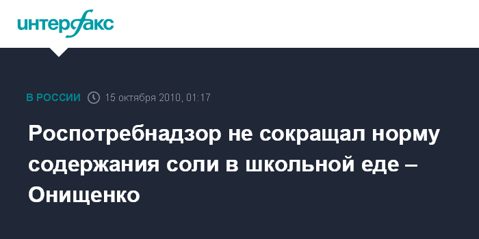 Москва. 15 октября. ИНТЕРФАКС - Глава Роспотребнадзора, главный санитарный врач РФ Геннадий Онищенко заявляет, что его ведомство не сокращало вдвое норму содержания соли в школьном меню, и что проблемы детского питания намного шире и сложнее.