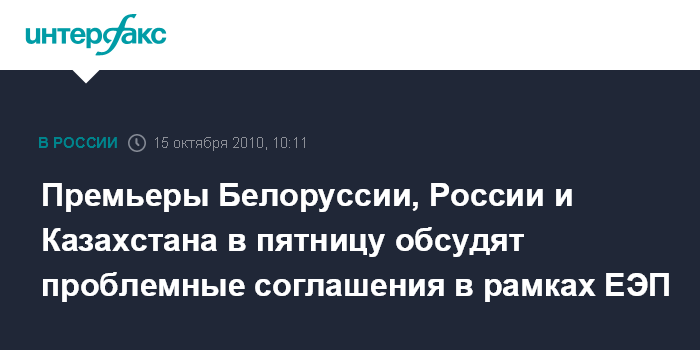 Москва. 15 октября. INTERFAX.RU - Премьер-министры Белоруссии, России и Казахстана в пятницу в Москве проведут рабочую встречу, на которой обсудят наиболее проблемные соглашения в рамках процесса по формированию Единого экономического пространства, сообщил журналистам накануне источник в правительстве РФ.