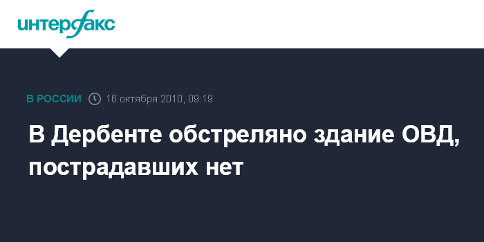 Махачкала. 16 октября. ИНТЕРФАКС-ЮГ - В Дагестане совершено нападение на ОВД города Дербент, жертв и пострадавших нет.