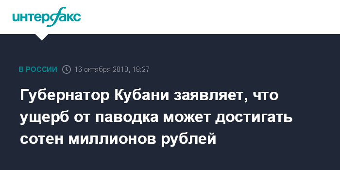 Краснодар. 16 октября. INTERFAX.RU - Ущерб, причиненный стихией, составит несколько сот миллионов рублей, заявил губернатор Краснодарского края Александр Ткачев в субботу. "Очевидно, уже сейчас можно говорить, что причиненный ущерб будет исчисляться сотнями миллионов рублей", - цитирует слова губернатора пресс-служба администрации края.