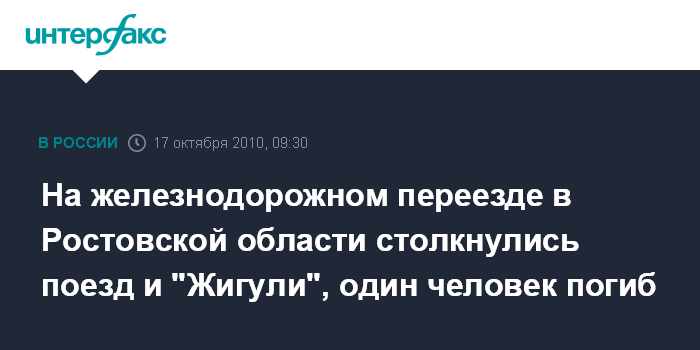 Ростов-на-Дону. 17 октября. ИНТЕРФАКС-ЮГ - Грузовой поезд столкнулся в Ростовской области с легковым автомобилем, один человек погиб, еще один пострадал, сообщили агентству "Интерфакс-Юг" в главном управлении МЧС РФ по области в воскресенье.