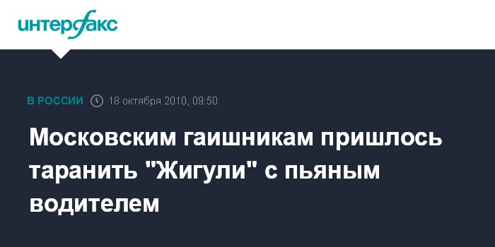 Москва. 18 октября. INTERFAX.RU - Инспекторы ГИБДД были вынуждены пойти на таран, чтобы остановить пьяного водителя в Москве, сообщил "Интерфаксу" источник в правоохранительных органах.