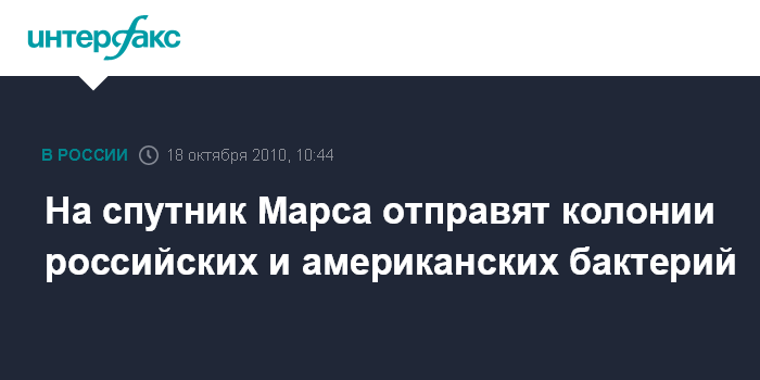 "В возвращаемой капсуле межпланетной станции "Фобос-Грунт" будут не только образцы грунта Фобоса, но и пассажиры. Три группы исследователей из Института медико-биологических проблем, Географического факультета МГУ и Межпланетного общества США поселили в капсуле колонии бактерий, которые должны пережить полет к Фобосу, работу на нем и возврат обратно. В каком-то смысле возникает соревнование, чьи бактерии окажутся живуче - русские или американские ", - сказал Зеленый.