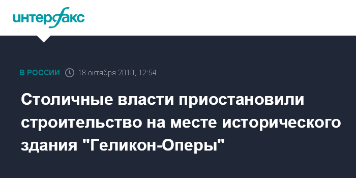 Москва. 18 октября. INTERFAX.RU - Московскими властями принято решение о временной приостановке нового строительства на месте исторического здания театра "Галикон-Опера" на Большой Никитской улице в центре столицы.