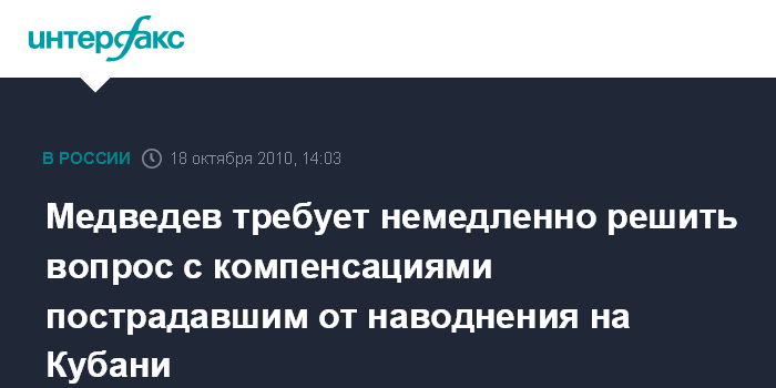Москва. 18 октября. INTERFAX.RU - Президент России Дмитрий Медведев поручил в течение дня решить вопрос с компенсациями пострадавшим от наводнения в Краснодарском крае.