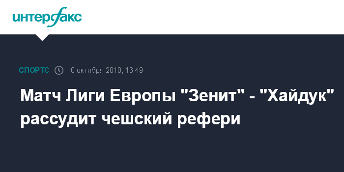 Москва. 18 октября. INTERFAX.RU - Матч третьего раунда группового этапа Лиги Европы УЕФА между "Зенитом" (Cанкт-Петербург) и "Хайдком" (Сплит) рассудит чешская бригада арбитров.