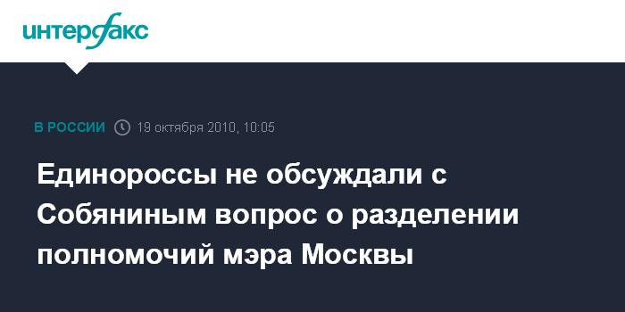 Москва. 19 октября. INTERFAX.RU - Фракция "Единая Россия" в Мосгордуме не поднимала на встрече с кандидатом на пост столичного градоначальника Сергеем Собяниным вопрос о разделении полномочий мэра Москвы и главы городского правительства, сообщил в понедельник журналистам руководитель фракции Андрей Метельский.