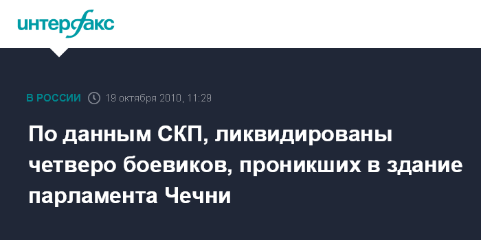 Москва. 19 октября. INTERFAX.RU - По предварительной информации, в здание парламента Чечни во вторник утром проникли четверо вооруженных лиц, сообщил "Интерфаксу" официальный представитель СКП РФ Владимир Маркин.