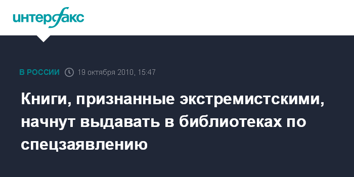 Москва. 19 октября. INTERFAX.RU- Литературу, признанную экстремистской, снова начали выдавать исследователям в нескольких библиотеках России, сообщила главный хранитель Российской государственной библиотеки Нина Хахалева