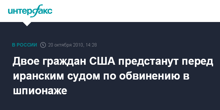 Вашингтон. 20 октября. INTERFAX.RU - Граждане США Шейн Бауэр и Джош Фаттал, более года находящихся в иранской тюрьме, предстанут перед судом по обвинению в незаконном проникновении на территорию Исламской республики и шпионаже, сообщает в среду телекомпания Эн-Би-Си со ссылкой на иранские СМИ.