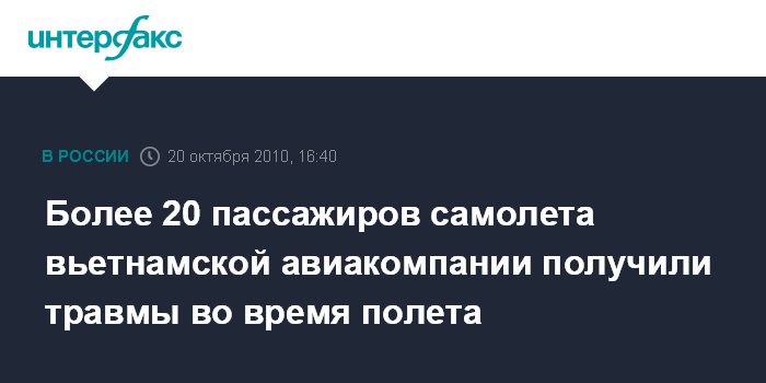 Париж. 20 октября. INTERFAX.RU - Минимум 24 человека, находившихся на борту самолета авиакомпании "Вьетнам эйрлайнс", получили травмы во время полета, сообщают в среду французские СМИ.