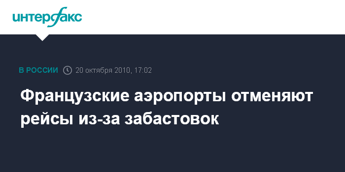 Париж. 20 октября. INTERFAX.RU - Работа некоторых французских аэропортов нарушена из-за акций протеста против пенсионной реформы, передает в среду французская радиостанция "Франс Энфо".