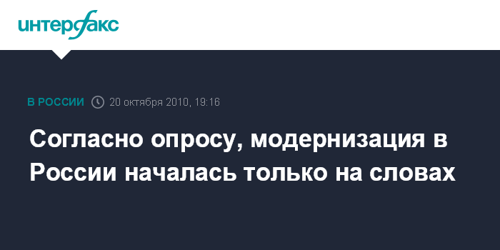 Москва. 20 октября. INTERFAX.RU - Преобразования в России, о старте которых заявлял президент страны Дмитрий Медведев в своей программной статье «Россия, вперёд!», началась лишь на словах, но не на деле, – уверен 61% россиян, опрошенных исследовательским центром рекрутингового портала Superjob.ru.