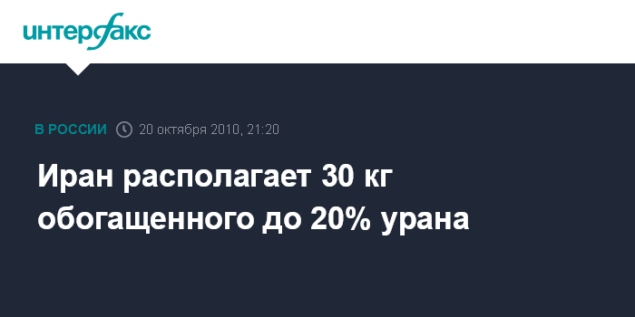 Тегеран. 20 октября. INTERFAX.RU - Власти Ирана располагают 30 кг урана, обогащенного до 20%, заявил в среду в интервью иранскому телеканалу Press TV глава Иранской организации по атомной энергии Али Акбар Салехи.