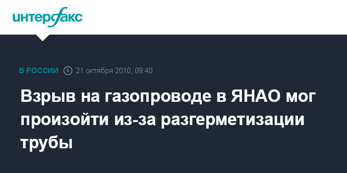 Салехард. 21 октября. INTERFAX.RU - Взрыв газа на внутрипромысловом газопроводе на территории Ханчейского месторождения в Ямало-Ненецком автономном округе, по предварительной версии, произошел из-за разгерметизации трубы, сообщили агентству "Интерфакс" в пресс-службе прокуратуры ЯНАО.
