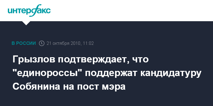 Москва. 21 октября. INTERFAX.RU - Председатель Госдумы РФ Борис Грызлов подтвердил, что фракция "Единая Россия" в Мосгордуме поддержит кандидатуру Сергея Собянина для наделения полномочиями мэра Москвы в четверг.