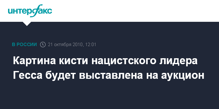 Лондон. 21 октября. INTERFAX.RU - Картина кисти лидера национал-социалистической немецкой рабочей партии Рудольфа Гесса, бывшего третьим человеком в партии после Гитлера и Геринга, будет продана с аукциона в городе Линкольн на востоке Англии, сообщает в четверг газета Daily Telegraph.