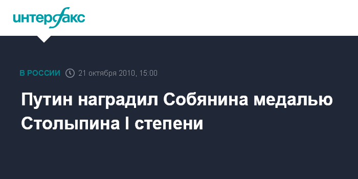Москва. 21 октября. INTERFAX.RU - Премьер РФ Владимир Путин подписал документы о награждении Сергея Собянина правительственной наградой -медалью Столыпина I степени.