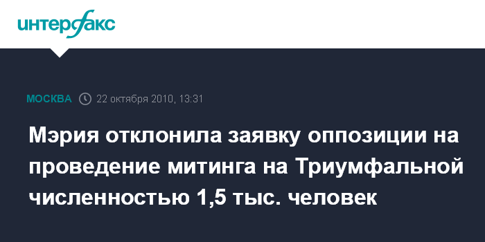 Москва. 22 октября. INTERFAX.RU - Правительство Москвы расценило как провокацию предложение представителей оппозиции увеличить численность участников митинга на Триумфальной площади до 1,5 тыс. человек, поэтому заявка на организацию акции отклонена.