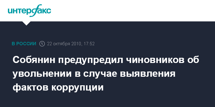 Москва. 22 октября. INTERFAX.RU - Новый мэр Москвы Сергей Собянин поручил членам столичного правительства обратить особое внимание на противодействие коррупции и предупредил, что в случае выявления фактов коррупционного поведения будут приниматься кадровые решения.