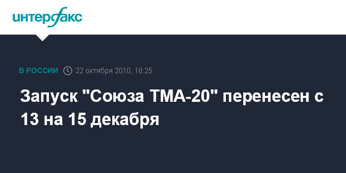 Королев (Московская область). 22 октября. - Запуск пилотируемого космического корабля "Союз ТМА-20", спускаемый аппарат которого был поврежден при транспортировке на космодром "Байконур", переносится с 13 декабря на двое суток, сообщил "Интерфаксу" президент ракетно-космической корпорации "Энергия" Виталий Лопота.