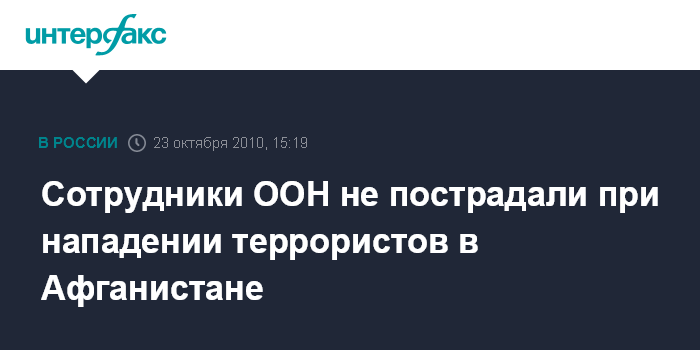 Кабул. 23 октября. INTERFAX.RU - Представители ООН в Афганистане объявили, что никто из их коллег не пострадал во время нападения террористов, произошедшего ранее в субботу в городе Герате. По последним данным, четверо террористов-смертников, попытавшихся прорваться в принадлежащее ООН здание, погибли. Один из них взорвал бомбу у входа в здание, а еще трое расстались с жизнью во время перестрелки с сотрудниками службы безопасности уже в самом помещении. У всех террористов было оружие и пояса со взрывчаткой. Пока не уточняются, есть ли жертвы среди охранников здания ООН.