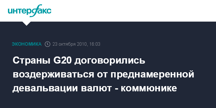 Кенджу (Южная Корея). 23 октября. INTERFAX.RU - Страны G20 договорились перейти к рыночно взвешенным системам обменного курса, базирующимся на основах экономики, а также воздержаться от конкурентной девальвации валют, говорится в коммюнике по итогам встречи министров финансов и глав Центробанков "двадцатки" в Кенджу. При этом страны с развитой экономикой, в том числе с резервными валютами, будут следить за чрезмерной волатильностью и беспорядочным движения валютных курсов. Эти меры, по мнению "двадцатки", помогут снизить риск сильных изменений потоков капитала, с которыми сталкиваются некоторые развивающиеся страны.