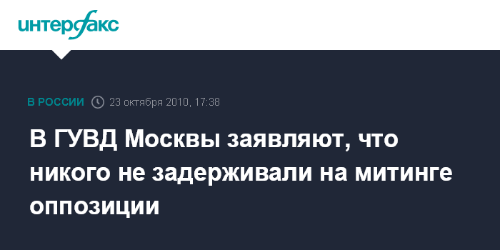 Москва. 23 октября. INTERFAX.RU - В столичном ГУВД не подтвердили утверждения представителя оппозиции, который заявлял о задержании своих сторонников в ходе акции в центре Москвы. "Митинг на Пушкинской площади прошел без каких-либо задержаний его участников", - сообщил "Интерфаксу" сообщил дежурный офицер группы оперативно-информационного реагирования столичного ГУВД Анатолий Ластовецкий.