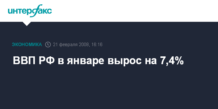 Москва. 21 февраля. INTERFAX.RU - ВВП РФ в январе 2008 года вырос на 7,4% по сравнению с январем 2007 года, заявил журналистам замглавы Минэкономразвития РФ Андрей Белоусов.