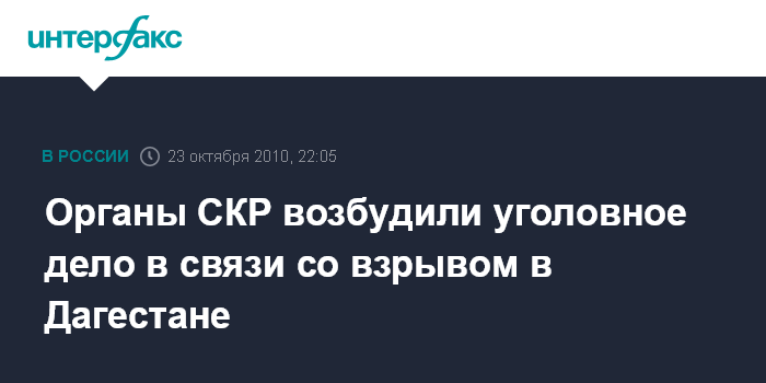 Москва. 23 октября. ИНТЕРФАКС - По факту взрыва в дагестанском Хасавюрте возбуждено уголовное дело по ряду статей УК РФ, в том числе по статье "терроризм", сообщает Следственный комитет России.