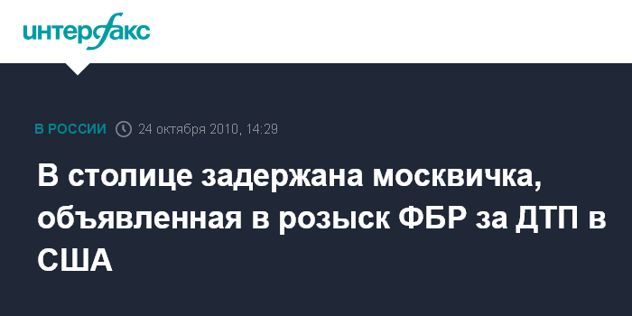 Москва. 24 октября. INTERFAX.RU - 33-летняя москвичка, проживающая на улице Удальцова и объявленная в розыск ФБР США, задержана в Москве в ходе совместной спецоперации оперативников уголовного розыска и сотрудников Национального центрального бюро Интерпола. Как установлено, несколько месяцев назад на территории США москвичка, будучи сильно пьяной, совершила ДТП, в результате которого погиб человек. Она была задержана на месте происшествия полицией, и после проведения следственных действий женщину отпустили, обязав ее явиться к следователю по первому требованию. Но женщина немедленно, после того как ее отпустили из полиции, вылетела в Москву. ФБР США объявило ее в международный розыск.