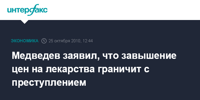 Москва. 25 октября. INTERFAX.RU - Искусственное завышение цен на лекарства аморально и преступно, заявил президент РФ Дмитрий Медведев.