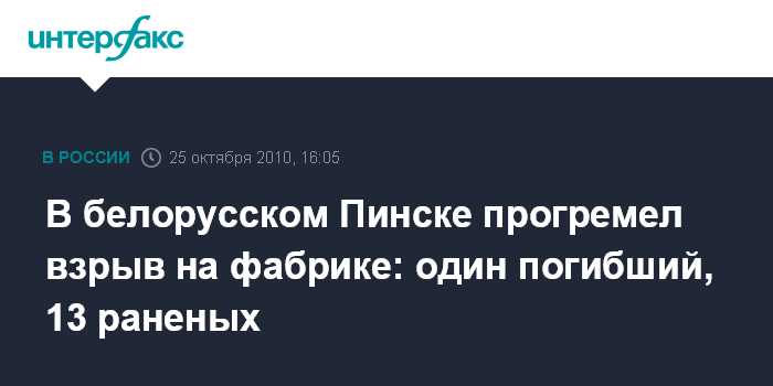 Минск. 25 октября. INTERFAX.RU - В городе Пинске Брестской области Белоруссии произошел взрыв в одном из цехов фанерной фабрики, в результате один человек погиб, более десяти доставлены в больницу, сообщили агентству "Интерфакс" в понедельник в Брестском областном управлении МЧС.