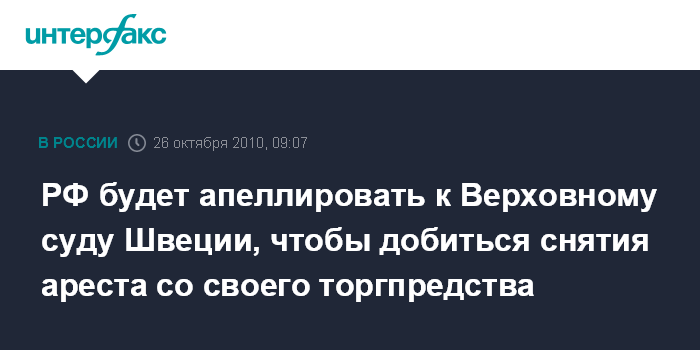 Москва. 26 октября. ИНТЕРФАКС - Россия будет отстаивать свою позицию в споре с немецким бизнесменом Францем Зедельмайером из-за собственности в Швеции и обратится в Верховный суд этой страны после получения документов об аресте торгпредства под Стокгольмом.