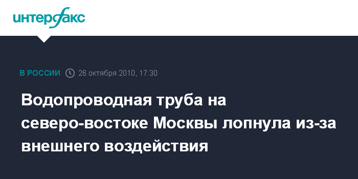 Москва. 26 октября. INTERFAX.RU - Авария на Маломосковской улице на северо-востоке Москвы произошла из-за механического воздействия на водопроводную трубу, сообщил "Интерфаксу" пресс-секретарь ГУП "Мосводоканал" Алексей Дашенко во вторник.