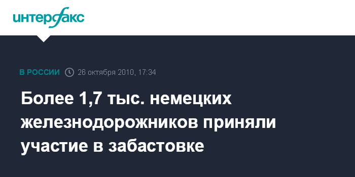 Берлин. 26 октября. INTERFAX.RU - Работники немецких железных дорог во вторник завершили забастовку, вызвавшую серьезные перебои в движении поездов, сообщает во вторник веб-сайт немецкого журнала "Фокус". Акция протеста началась в понедельник поздно вечером и завершилась в 11 часов утра по местному времени.