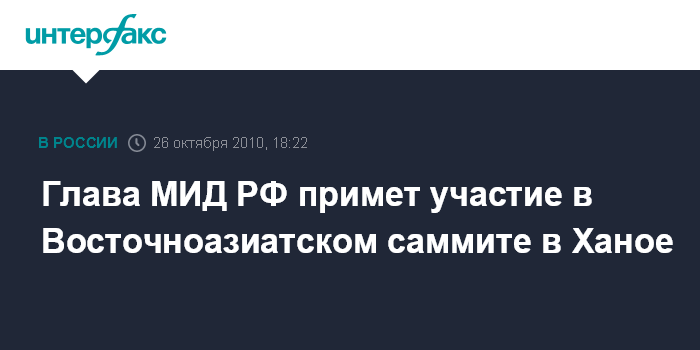 Москва. 26 октября. INTERFAX.RU - Министр иностранных дел России Сергей Лавров 30 октября примет участие в очередном Восточноазиатском саммите, который пройдет в Ханое, сообщили в МИД РФ во вторник.