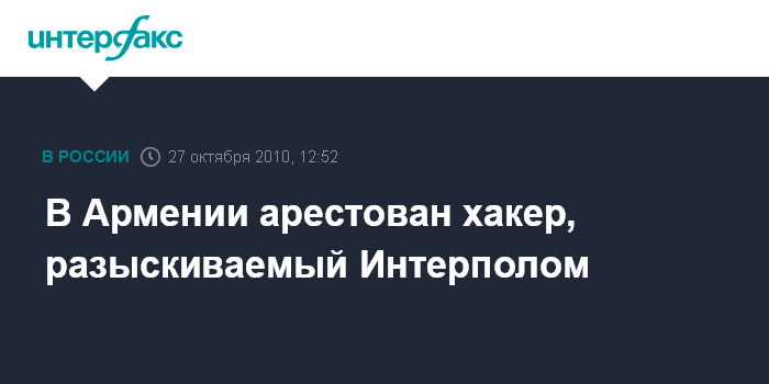 Ереван. 27 октября. INTERFAX.RU - В Армении по запросу Интерпола арестован хакер, гражданин РФ Георгий Аванесов, сообщили в среду "Интерфаксу" в пресс-службе полиции республики.